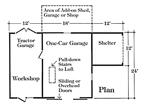 Plans are $59.00 plus $5.00 for shipping, for three complete sets of drawings. The plans come with a complete money-back guarantee and include a variety of optional add-on sheds, shops, garages, greenhouses and carports that help you build any of sixteen standard layouts, including the one shown above. All sixteen of the standard layouts are shown on the plans you'll receive. You can build any of them, or you can use the main building plans and any of the add-ons to create your own custom design.