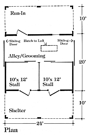 Chestnut 2-Stall Horse Barn and Run-In - This pole-barn combines a big front-to-back alley and a hay loft with two horse stalls that open on a covered grooming area. On the opposite side there's a shed-roof shelter for equipment or for a loafing shed. Click on the barn to see a floor plan with dimensions. Blueprints are available at BackroadHome.net