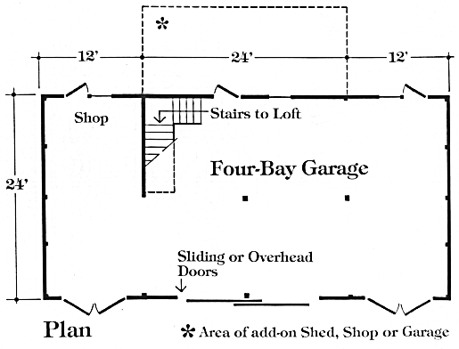 has four 12'x24' parking bays and stairs to a 24'x24' storage