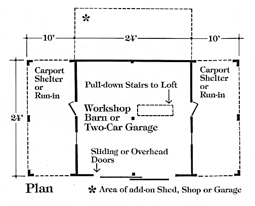 Garage has a 24'x24' two-bay garage and two 10'x24' carports for